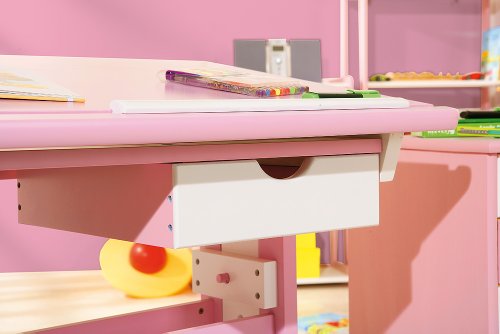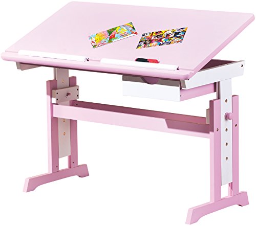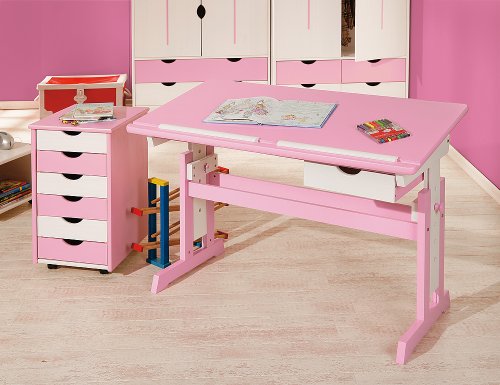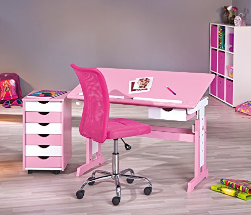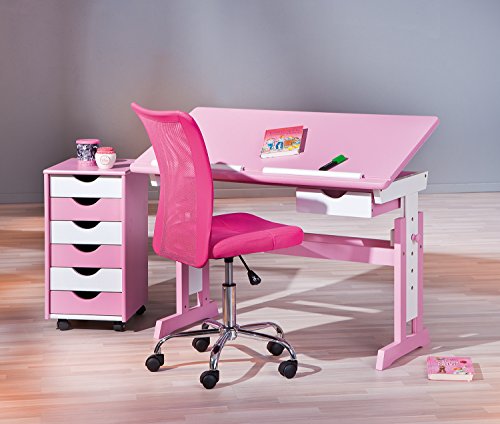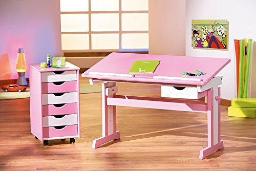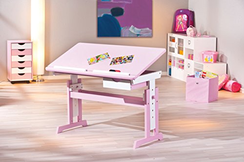 Der Traum aller kleinen Mädchen ist dieser trendige Kinderschreibtisch in rosa mit weißen Elementen. Zum einen ist dieser Kinderschreibtisch höhenverstellbar und auch der Neigungswinkel lässt sich verändern. Zum anderen bietet der Schreibtisch für Kinder einen optimalen Arbeitsplatz für Schüler. Er verfügt über eine nützliche Schublade wie auch eine Abrutschsicherung für Stifte. Er ist aus MDF/Massivholz gefertigt und lässt sich perfekt im Kinderzimmer arrangieren. Das trendige Design macht ihn zu einem echten Hingucker, sodass die Hausaufgaben sicherlich mit Freude erledigt werden. Ein funktionaler und dennoch schicker und höhenverstellbarer Schreibtisch, der für verschiedene Altersstufen die ideale Sitzposition ermöglicht und damit eine ideale Grundlage für ein erfolgreiches Lernen bietet. Ein Schreibtisch für Kinder der mitwächst und sich so als eine zukunftsorientierte und praktikable Lösung präsentiert.